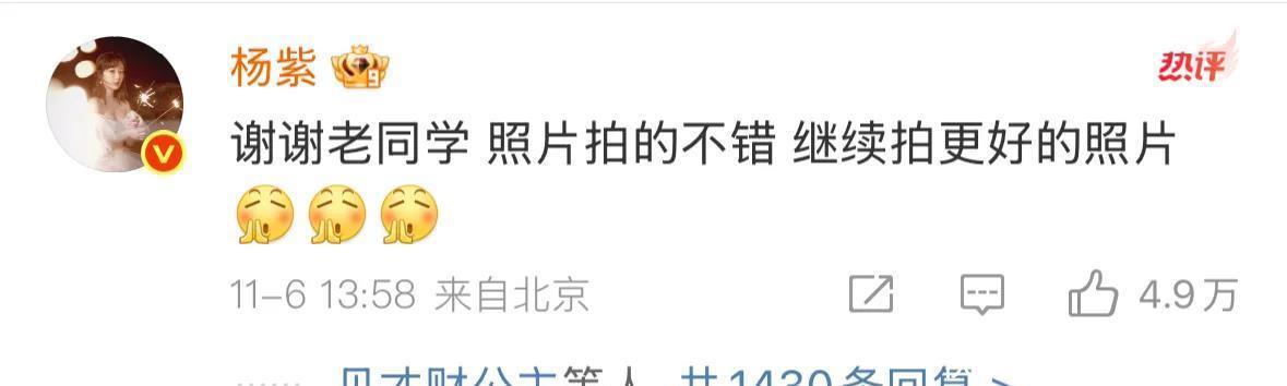 随后不久杨紫留言回应“谢谢老同学,照片拍的不错,继续拍更好的照片”两人都以老同学称呼对方,在荧幕上也不是第一次合作了,友谊如此长久,让人羡慕,也期待他们未来能有更多更好的作品一起合作