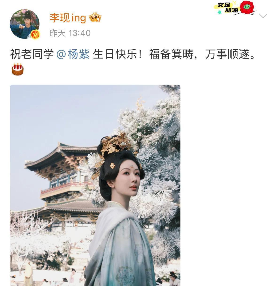 今年的生日和往常一样,李现已经连续8年为杨紫送上生日祝福,艾特杨紫并配文“老同学生日快乐,福备箕畴,万事顺遂”还配了一张杨紫在电视剧《国色芳华》饰演何惟芳的妆照照片